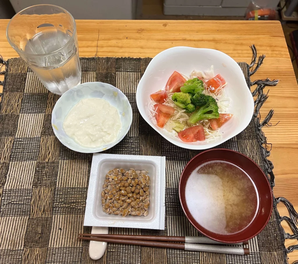 生野菜サラダ、りんご、納豆、豆乳ヨーグルト、ミックスナッツに制限し